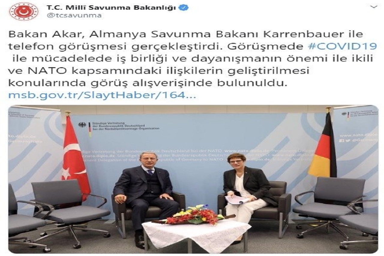 Milli Savunma Bakanı Hulusi Akar, Almanya Savunma Bakanı Annegret Kramp-Karrenbauer ile telefonda görüştü.